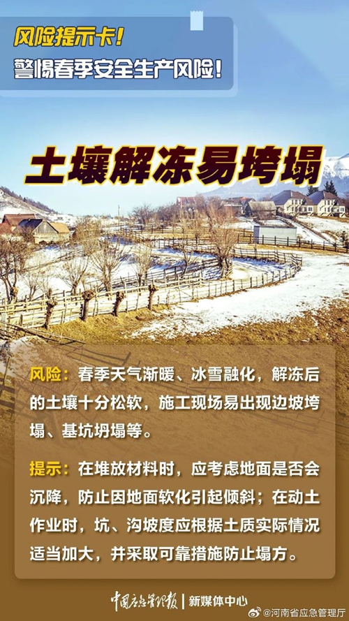 春季天氣多變,各行業(yè)復工復產(chǎn)步入正軌,生產(chǎn)節(jié)奏不斷加快的同時,應結(jié)合春季安全生產(chǎn)特點及時落實各項安全防范措施 ???。